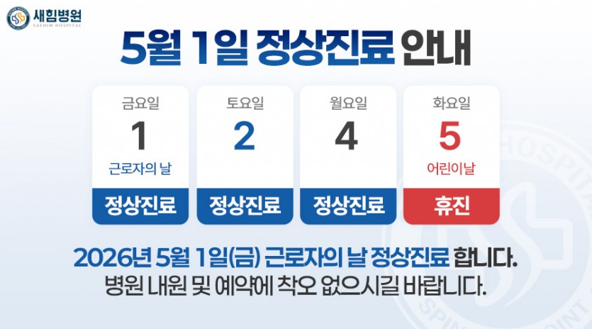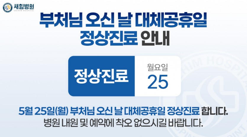 5월 5일은 휴진이며, 근로자의 날 1일과 부처님 오신날 대체공휴일 25일은 정상진료를 합니다.